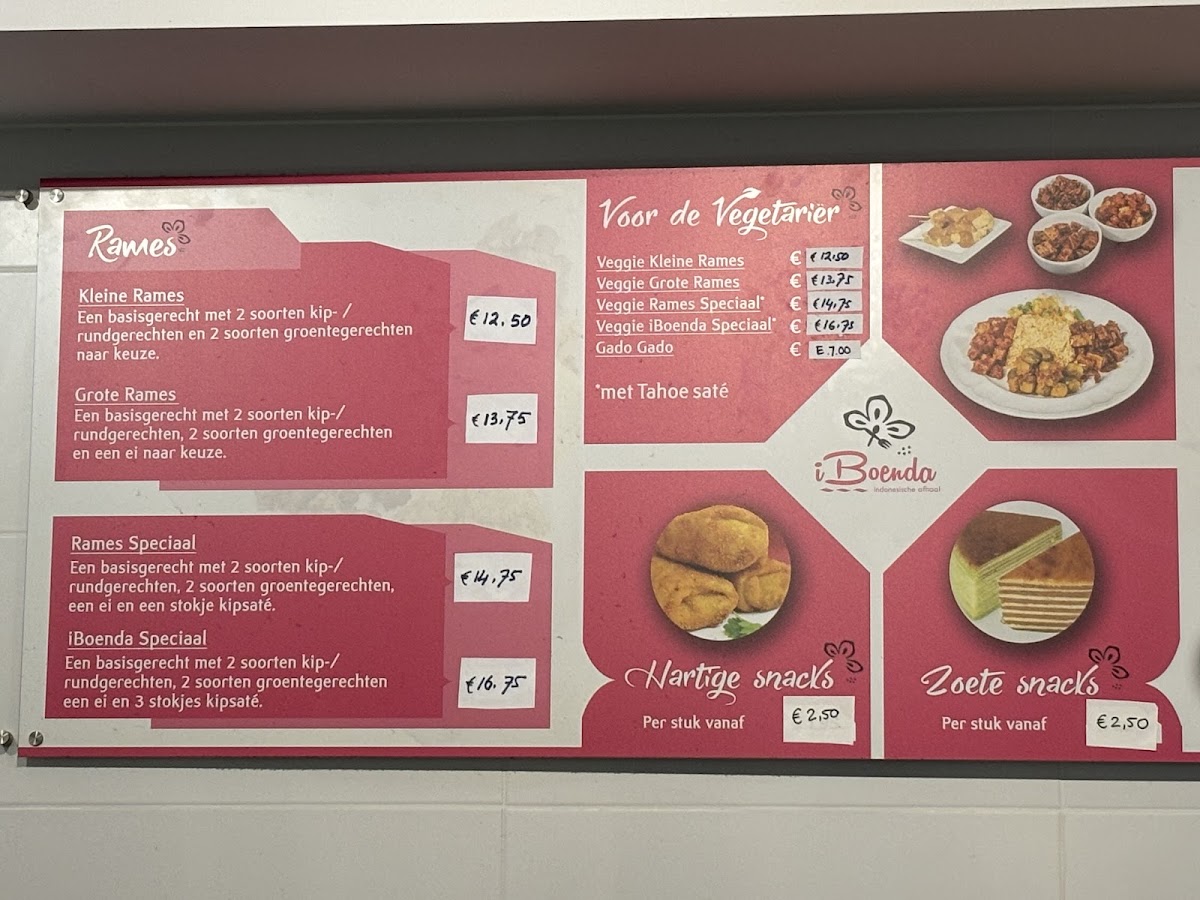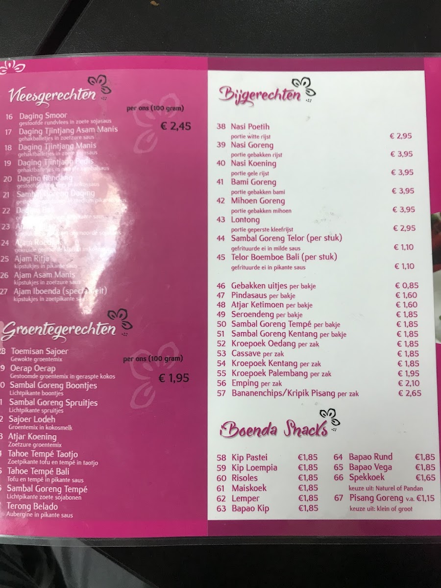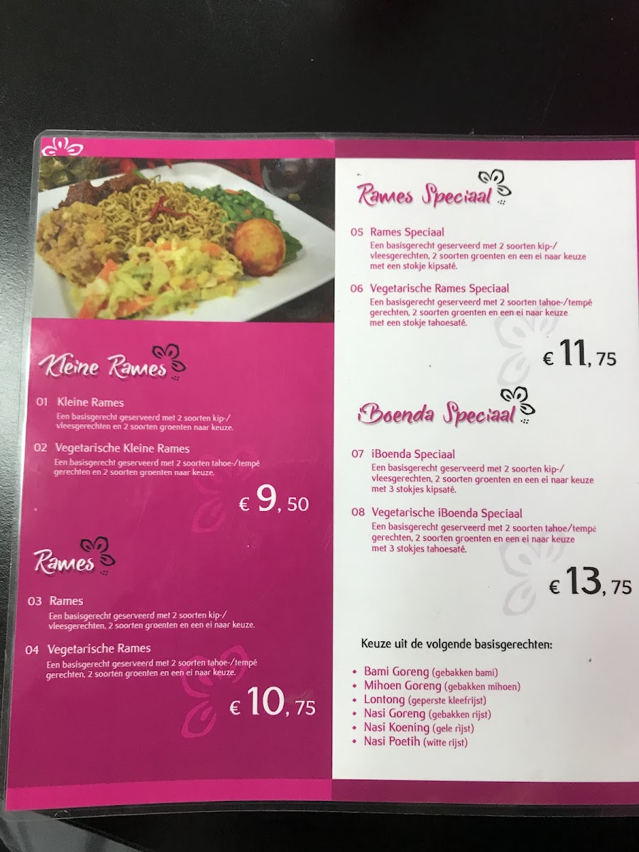 The menu at Iboenda Amsterdam offers a delightful and flavorful selection of dishes that capture the essence of Indonesian cuisine. Among the standout items, Sambal takes center stage, providing a spicy kick that pairs perfectly with any dish, adding depth and heat to the meal. The Saté is another must-try, featuring skewers of grilled meat served with a rich and savory peanut sauce, making it a perfect choice for those seeking a balanced blend of savory and sweet. For a unique twist, the Saté Jam Jam offers a more adventurous option, combining traditional satay with an unexpected jam element, creating a deliciously sweet contrast to the savory flavors. These dishes not only reflect the authentic Indonesian flavors but also showcase the creativity of the kitchen. Whether you’re a fan of spice or a lover of grilled meats, Iboenda's menu delivers a memorable dining experience with each dish.